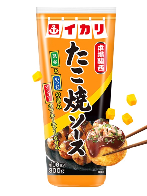 agua, azúcares (jarabe de maíz alto en fructosa, azúcar), verduras y frutas (tomate, manzana, cebolla, mango, piña), vinagre elaborado, sal, salsa de SOJA (TRIGO), cebolla, extracto de hojuelas de BONITO, especias, algas marinas en polvo, espesante E1400, potenciador de sabor E621.